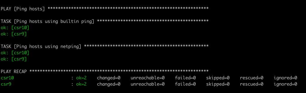 Instead we need to use another module – netcommon.net_ping to connect to the routers and have them ping an address on your network. In English -> Ansible, all hosts, Ansible Netcommon Net_ping module with arguments 'dest=127.0.0.1' using the inventory file 'hosts'. Replace 127.0.0.1 with a known destination on your network.