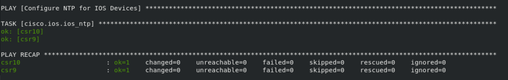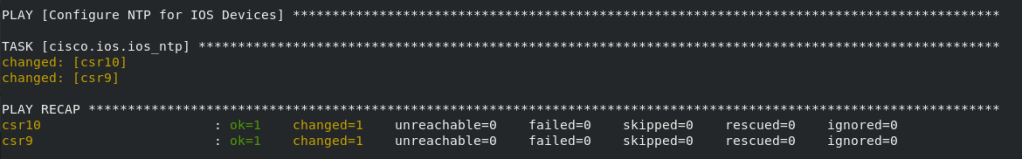 If we run this playbook with ansible-playbook configure-ntp.yaml -i hosts we see output like the following. We can see that the configuration on the two routers has been change.