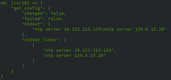 Under the hood, this variable is a JSON dictionary with 4 keys. changed, failed, stdout, stdout_lines. changed and failed are boolian values to show if this task is changing anything or failed in anyway. stdout and stdout_lines contain the same information but formatted in a different way. Both of these are the result of the command we ran show running-config full | include ntp server