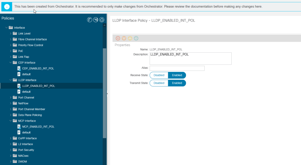 Now run terraform apply and log into ACI and take a look for yourself. We can see all three policies and the settings that we defined for them. Anyone familiar with Cisco’s MSO will notice This has been created from Orchestrator. It is recommended to only... While we did not use MSO to configure these settings, Terraform is nice enough to check the same box in the API so that we can see that is was not manually created.