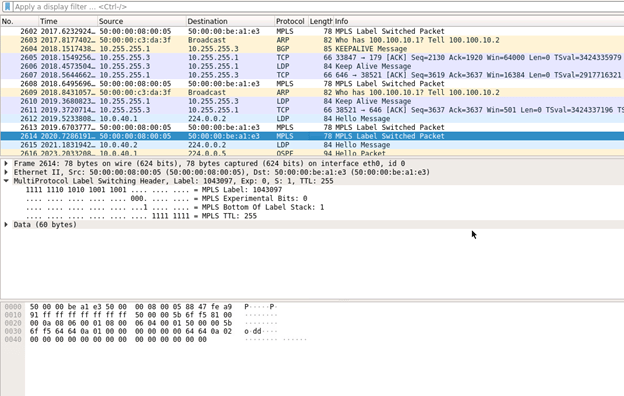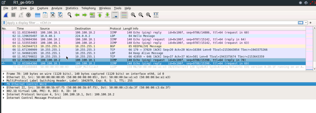 Here is a packet capture from on the link between R1 and R3 when a ping was sourced from PE1. You’ll notice Wireshark isn’t able to decipher any of the lower (actually higher? encapsulated?) layer protocol information. This is because the shim – Control Word – is not added to the header.